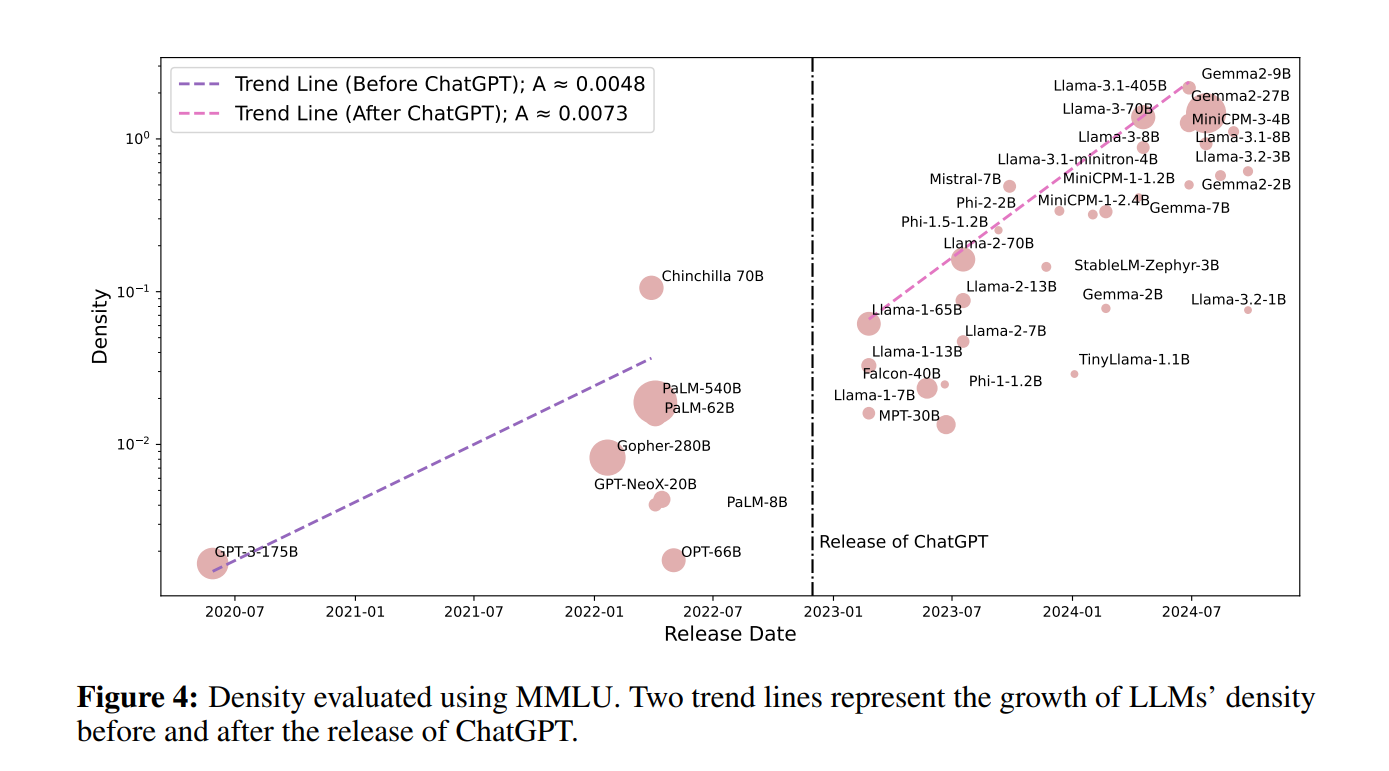 - LLM의 "Capacity Density(밀집도)"는 시간이 지남에 따라 지수적으로 증가
